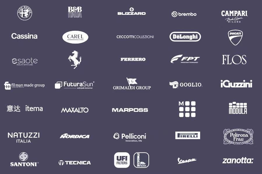 This philosophy connects 35 leading brands showcased in the museum, spanning various sectors. In transportation automotive and Luxury, notable names include Ferrari, Alfa Romeo, Ducati, and Vespa, alongside industry leaders like Pirelli, Ufi Filters, Brembo, FPT Industrial, Grimaldi and Modula.