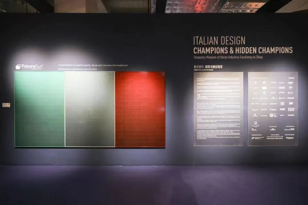 During the museum tour, the Italian flag stands out, crafted from a vibrant selection of glass colors and textures, harmonizing aesthetically with the solar panels by Futurasun.