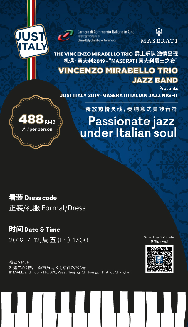 The China-Italy Chamber of Commerce is glad to invite you to the "Just Italy 2019 – Maserati Italian Jazz Night" dinner - organized in the framework of the CICC Italian Week - that will be held the 12th July 2019 from 17.00 at IP MALL, Shanghai.