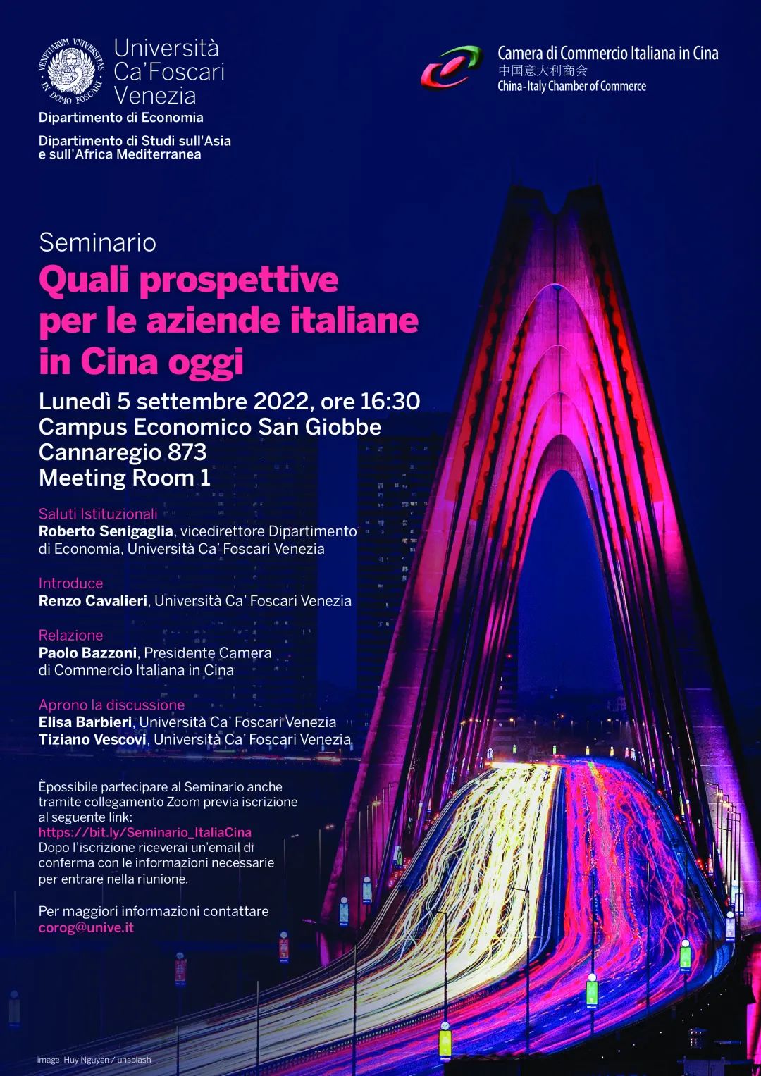 Nell’arco della stessa giornata si è tenuto presso il Campus Economico San Giobbe di Venezia anche il seminario “Quali prospettive per le aziende italiane in Cina oggi” organizzato da CCIC e dal Dipartimento di Economia di Ca’ Foscari, che ha visto la partecipazione del Presidente Bazzoni insieme ai docenti dell’Università Prof.ssa Elisa Barbieri, Prof. Tiziano Vescovi e Prof. Giancarlo Corò, alla presenza del Prof. Roberto Senigaglia, Vicedirettore del Dipartimento di Economia dell’Università Ca’ Foscari, e del Prof. Renzo Cavalieri. Si segnala inoltre l’intervento del Presidente del Porto di Venezia Fulvio Lino Di Blasio e la presenza del Vice Presidente CCIC per la Cina del Nord, Matteo Tanteri. Una quarantina i partecipanti presso l’ateneo e circa un centinaio da remoto, tra cui diversi rappresentanti d’impresa e studenti.