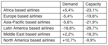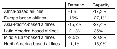 Below you can find year-on-year regional performances of airlines in terms of demand and capacity for 2020 according to IATA reports.
